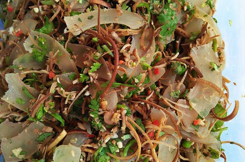 Người Tày ở Lâm Bình đã biến da trâu thành đặc sản trên mâm cơm những dịp đặc biệt. Da trâu hơ qua lửa rồi ngâm với nước lã. Sau khi được làm sạch, đem luộc từ 1 tiếng rưỡi đến 2 tiếng rồi thái mỏng. Nộm da trâu cần gia giảm thêm các loại gia vị và rau thơm như lạc, mùi ta, mùi tàu, mắc khén và hoa chuối. Vị ngọt của da trâu, bùi của lạc rang, thơm của các loại gia vị hòa quyện thành món ăn đặc biệt.